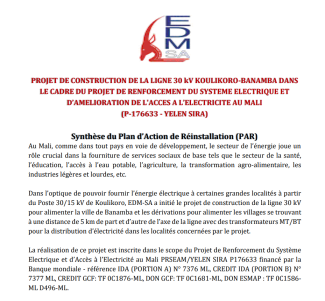 PROJET DE CONSTRUCTION DE LA LIGNE 30 kV KOULIKORO-BANAMBA DANS LE CADRE DU PROJET DE RENFORCEMENT DU SYSTEME ELECTRIQUE ET D’AMELIORATION DE L'ACCES A L’ELECTRICITE AU MALI (P-176633 - YELEN SIRA)