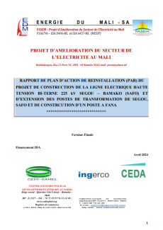RAPPORT DE PLAN D’ACTION DE REINSTALLATION (PAR) DU PROJET DE CONSTRUCTION DE LA LIGNE ELECTRIQUE HAUTE TENSION BI-TERNE 225 kV SEGOU – BAMAKO (SAFO) ET D’EXTENSION DES POSTES DE TRANSFORMATION DE SEGOU, SAFO ET DE CONSTRCUTION D’UN POSTE A FANA
